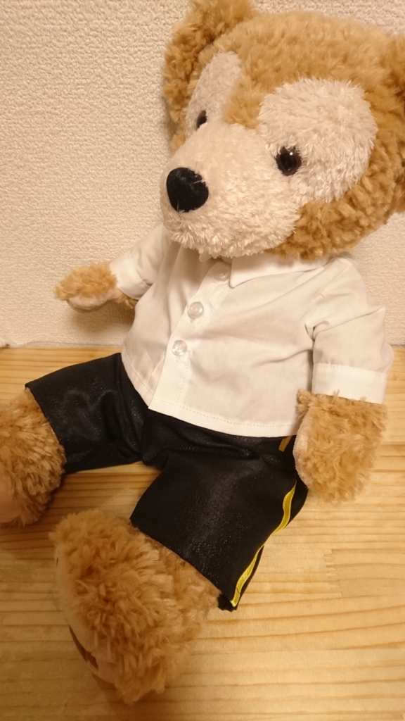 シンプルな白シャツに黄色のラインが入った長ズボンです。